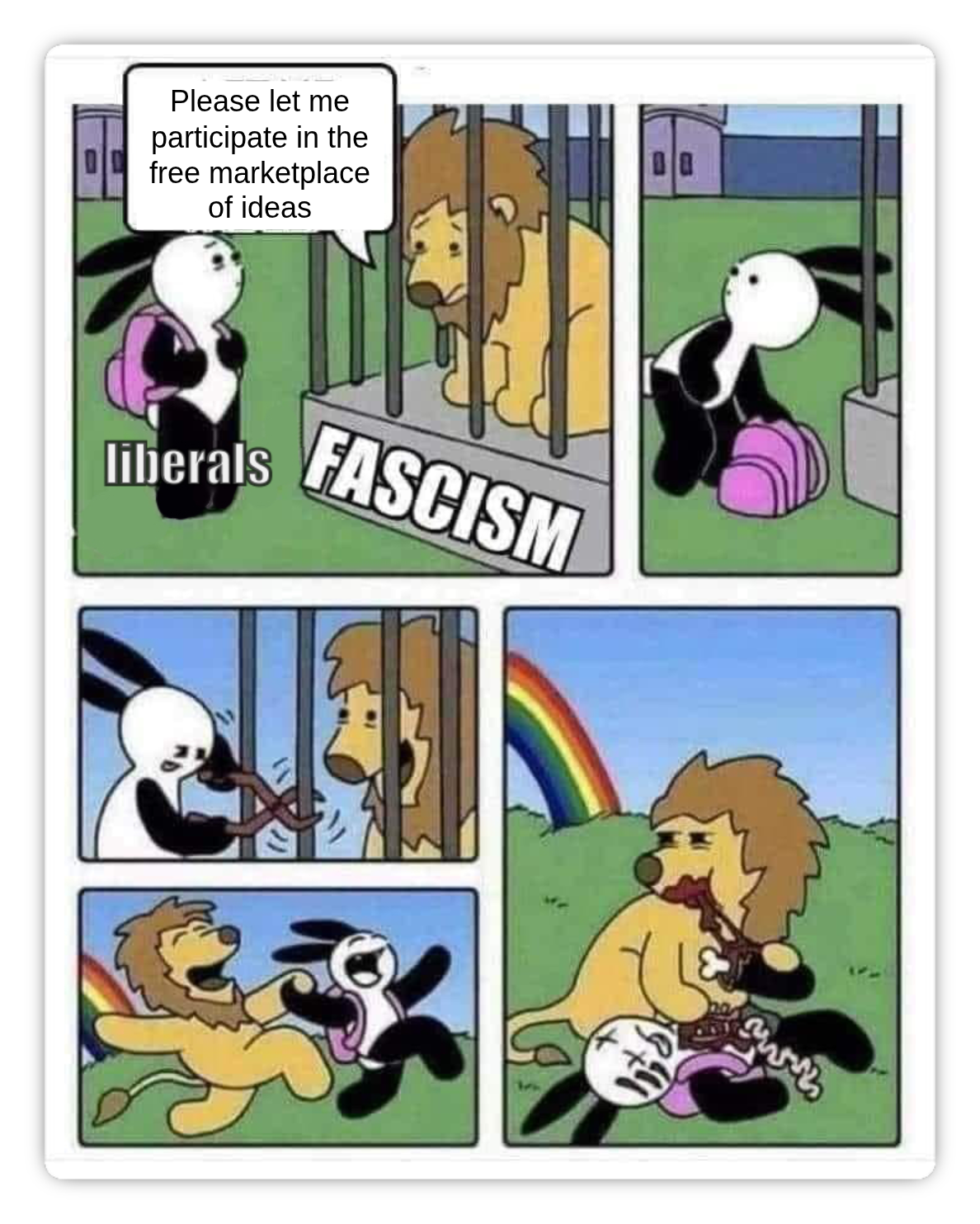 “To guarantee that your opponents recognize your right to exist, you have to recognize your opponents’ right to exist”: this can maybe be called “the liberal deal”. And as long as all parties abide by it, there is much to be said for it.
